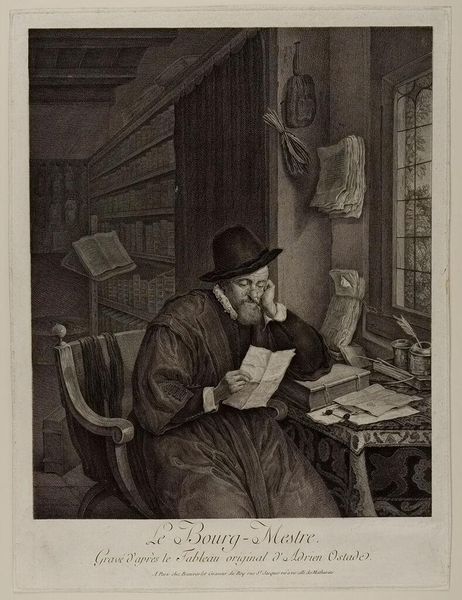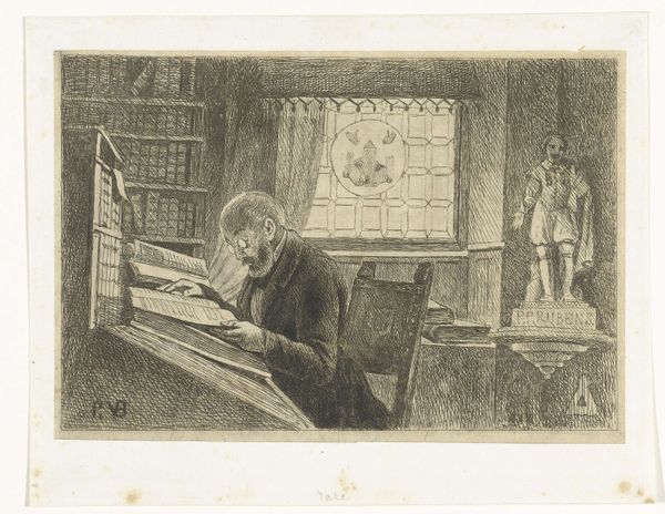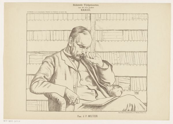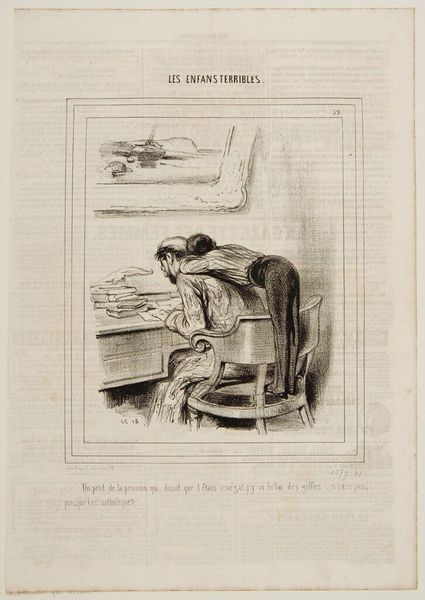 Editor: This is "If I were to not be reelected!" by Honoré Daumier. It looks like a lithograph, and the composition seems to focus on the figure's intense concentration. What do you see in the visual construction of this piece? Curator: The strength lies in Daumier's economy of line. Notice how the hatching defines the figure's form and conveys the weight of his concern. The stark contrast emphasizes the psychological tension, wouldn't you agree? Editor: That’s interesting. I was focusing more on the overall mood, but looking at the lines it adds so much more depth. Curator: Indeed. The formal elements are not merely descriptive, they actively construct the meaning. It demonstrates how line alone can deliver such potency. Editor: I hadn’t considered how the technique contributes to the overall message. Thanks for sharing that!