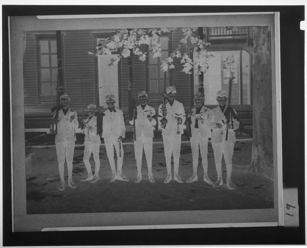 Curator: This photograph, by Hamblin Studio, is titled “Untitled (men and women posed on porch of brick building).” The exact date is unknown. Editor: It's striking how the light in this image seems to bleach out any sense of individuality, almost rendering the figures as archetypes. Curator: Absolutely, and that's where it becomes fascinating. Look at the composition – the rigid formality, the way the figures are arranged on the porch. It speaks to the social codes and power dynamics of the time. Editor: The architecture itself—the brick, the porch—becomes an emblem. A symbol, perhaps, of aspiration and belonging, loaded with social meaning. Curator: Precisely. We can read this image as a commentary on class, race, and gender, and how those identities were constructed and performed in public life. Editor: The way the figures almost blend into the architecture makes me wonder if they consciously tried to embody those symbolic structures, as though they were an extension of the building. Curator: It prompts us to consider how representation can both reflect and reinforce societal norms. Editor: An interesting perspective; the image provides plenty to ponder.