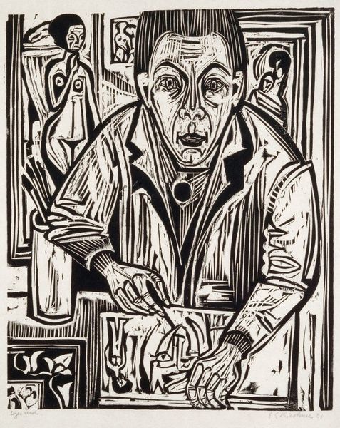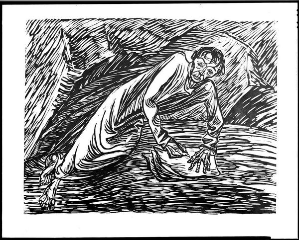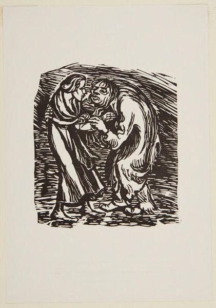 Curator: This woodcut, "Merciful Samaritan" by Ernst Barlach, now resides at the Harvard Art Museums, its dimensions surprisingly intimate. The block itself is only about 18 by 13 centimeters. Editor: The stark black and white imagery immediately conveys a sense of urgency and compassion, but also a world of hardship and suffering. The lines are so raw. Curator: Barlach was deeply influenced by Expressionism and his experiences during World War I. He chose woodcut, a more accessible medium, to connect with a wider audience, perhaps commenting on the social issues of his time. Editor: Absolutely. The choice of this biblical subject aligns with a broader history of representing marginalized bodies and underscores the enduring struggle for social justice. It speaks volumes about empathy in times of crisis, doesn't it? Curator: It truly does. The deliberate carving, the labor involved, emphasizes the physical act of helping, while the mass production allows for wider distribution of this important message. Editor: Considering the historical context certainly enriches my understanding. It is still a powerful piece with strong social and political implications. Curator: Indeed, a work that continues to provoke thought about humanity and our responsibilities.