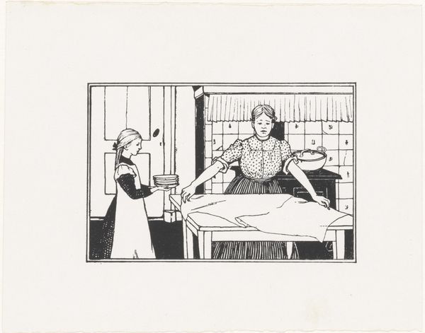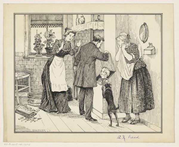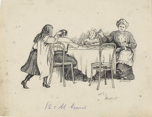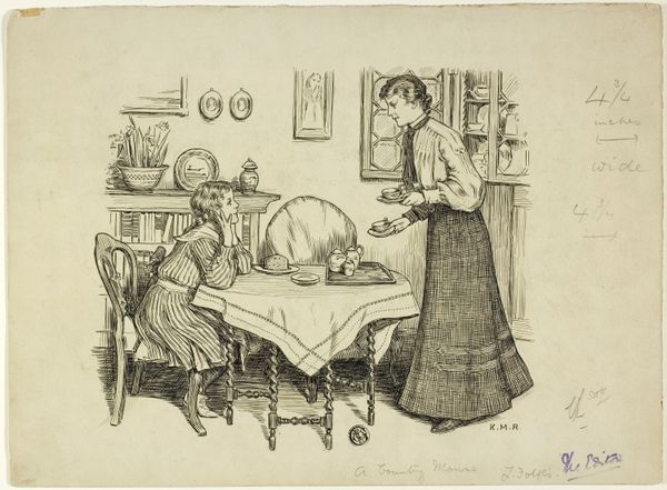 Editor: This pen and ink drawing is called "Too Many Cooks" by Katherine May Roberts, created sometime between 1900 and 1913. There's almost a chaotic energy with these kids all crammed into one kitchen space. What can you tell me about this work? Curator: It's fascinating to consider this through the lens of domestic labor and the evolving roles of women and children in the early 20th century. Roberts, working within the Arts and Crafts movement, likely aimed to critique the sentimental idealization of domesticity. The title itself suggests a disruption of the traditional, orderly household. How do you read the children’s interactions in terms of power dynamics? Editor: I guess I hadn't considered the "power dynamics." I just saw them as, well, kids making a mess! Curator: Exactly! And isn't that disruption potentially subversive? Roberts is not just depicting children playing; she's using the trope of childhood innocence to subtly question the prescribed roles within the home. What do you notice about their clothing, and how might that contribute to this reading? Editor: They're wearing these old-fashioned dresses and aprons. It feels very staged, like they’re playing at being adults. Curator: Precisely. Their performative engagement with domesticity highlights its artificiality. And think about who had the luxury to perform domestic roles in this period, and who did not. Considering race and class, whose labor is rendered invisible by this image? Editor: I see what you mean. This seemingly innocent scene brings up questions about gender, class, and even the hidden labor within a household. I’ll definitely look at art of this period differently now! Curator: I hope it encourages you to always think critically about what an image includes, but more importantly what it leaves out.