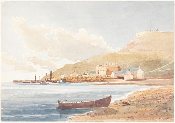 Editor: This watercolor painting, “Upper Italian Port,” was created around 1850 by Philipp Rumpf. It's a lovely cityscape! There's such a peaceful feeling evoked by the gentle colours and tranquil water. How do you interpret this work? Curator: The tranquility you observe is interesting, and I agree it is there. But what fascinates me most are the subtle yet pervasive symbols embedded within the architecture and figures. Do you see how the imposing tower, almost fortress-like, overlooks the everyday life of the port? It's not merely a structural element; it’s a signifier of power, tradition, perhaps even a slightly melancholic reminder of bygone eras imposing itself on the quotidian. Editor: I hadn't really considered the tower in that light, just as part of the landscape. So, you're seeing the architecture as almost...narrative? Curator: Precisely. The figures, too, are not just picturesque additions. Observe the group gathered at the water's edge. They are placed deliberately – at the base of these formidable architectural presences. Their quiet observation creates a juxtaposition – a contrast between communal existence and established power, isn’t it? What emotional connotations would you read in their apparent idleness? Editor: Hmm, maybe a sense of belonging, a shared experience of living in the shadow of this grand structure? There’s a calmness there, not a feeling of being oppressed, but… maybe sheltered? Curator: "Sheltered"—that's an astute observation. It shows us the cultural memory at work, this dance between security and potential constraint embodied within a single image. What an amazing dance it is! Editor: It really is! Now I can't unsee all the symbolic layers within this seemingly simple scene. Thanks so much.