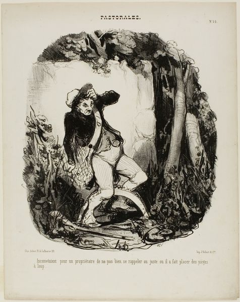 Curator: Daumier's lithograph, "Inconvenient for a Landowner Not to Remember Exactly Where He Set His Traps", strikes me immediately with its dark humor. The composition's claustrophobic, isn't it? Editor: Indeed, the dark hatching and swirling lines evoke a sense of disquiet, a visual representation of the landowner's predicament. This work speaks to the social commentary Daumier was known for; critiquing class and labor. Curator: I agree. The work reveals how quickly the hunter can become the hunted. The lithographic process itself, the cheap reproducibility, allowed Daumier to disseminate his views widely to critique the status quo. Editor: It's fascinating how the formal elements—the contrast, the line work—serve to amplify the satire. One feels the bite of the trap almost viscerally. Curator: Precisely. The material and the method are intrinsically linked to the message. It makes you think about power, class, and the tools used to maintain them. Editor: A potent reminder that art's visual language has the ability to unearth uncomfortable truths, even when cloaked in humor.
