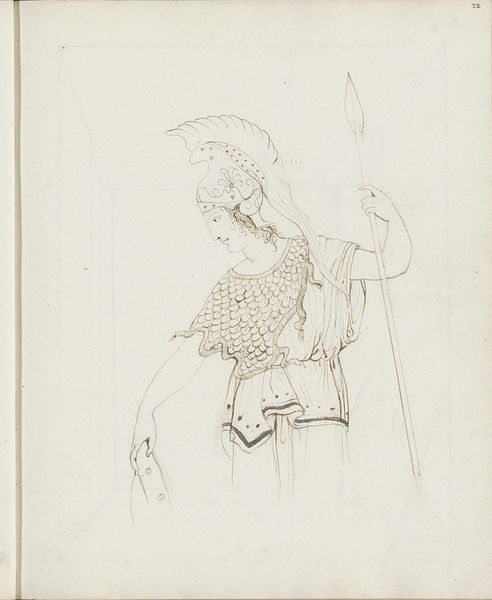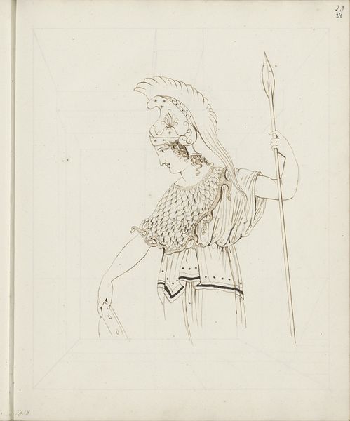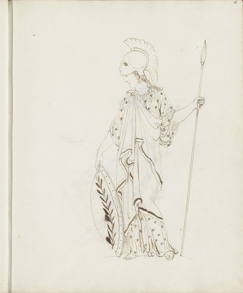 Editor: Here we have a drawing titled "Erminia" by Peter Cornelius. It looks like it’s done in pencil on toned paper, creating a somewhat ethereal quality. What catches my eye is how strong yet vulnerable she seems. What do you see in this piece? Curator: I see a confluence of classical ideals and emerging Romantic sensibilities. The figure is clearly inspired by classical statuary in her profile and contrapposto stance; but notice how the pencil work, the delicate hatching and use of light, lends her a dreamlike, almost fragile quality, diverging from the idealized strength often associated with classical depictions of warriors. The inclusion of what appears to be a fleur-de-lis is interesting: Do you know what that suggests to you? Editor: I guess it suggests some kind of royal affiliation? I hadn't really focused on it until you pointed it out. Curator: Precisely. It ties her not just to the visual language of antiquity but to the symbolism of power, lineage, perhaps even destiny. But observe the ghostlike quality of her lower body, how her legs seem to fade, echoing her hair waving around her. It makes me consider how power and vulnerability might exist side by side within an individual. Erminia’s stance with her sword is about to act in some dramatic capacity, a pose seen as evidence for a narrative, such as a poem. Cornelius has also used color only partially, like an iconographer pointing the direction of understanding. The way he depicts a sense of movement creates a complex interplay of strength and transience. Editor: So it's about contrasting those qualities to build a larger, maybe more complex narrative or understanding of the figure? I like how you've linked that vulnerability and royal imagery. Curator: Exactly. Cornelius isn't just presenting a warrior. He's delving into the psychological weight carried by those who embody such powerful symbols, echoing how personal narrative, poetry, drama, even power struggles all influence self-representation. Editor: This has given me so much to think about. Thanks, this was extremely useful. Curator: My pleasure. Seeing how symbols function allows us a window into cultural memory.