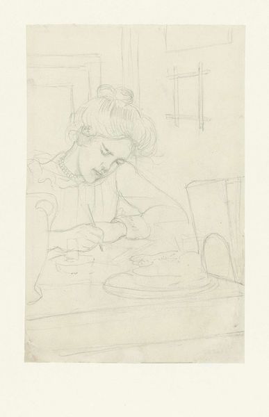 Curator: We’re standing before “Jonge vrouw leunend tegen een kussen,” or “Young Woman Leaning Against a Pillow,” a delicate etching by Jan Toorop, likely created between 1901 and 1928. It's currently held here at the Rijksmuseum. Editor: Immediately, it evokes a feeling of wistful quiet, doesn't it? Like a secret glance into a moment of personal reflection. The soft lines give it an intimate, almost dreamlike quality. Curator: Indeed. Note the way Toorop employs the etching technique to create a subtle interplay of light and shadow. The figure emerges almost ethereally from the negative space. Consider how the sinuous lines, so characteristic of Art Nouveau, define her posture and clothing. It reflects the style of that period perfectly. Editor: Absolutely, it’s all swooping curves and implied movement, like the drawing itself is breathing. And the composition… She's leaning back, almost surrendering to gravity, but there's also this undeniable elegance to her posture. She seems trapped between worlds. Curator: Precisely. There’s a palpable tension between repose and introspection, achieved through careful compositional choices. Her gaze is averted, further emphasizing a state of interiority. The pillow acts almost as a psychological barrier. Editor: A barrier, or maybe a comfort? It could be either. The lines are simple, minimal, but they speak volumes. You wonder what she’s thinking, what’s made her so pensive. And you’ve got to love the suggestion of detail without laboring the image. That slight blush on her cheek? Brilliant. Curator: Consider the serial number too, printed just outside the plate, at the bottom left. In the full context of Toorop’s oeuvre, this print encapsulates the spirit of fin-de-siècle melancholy blended with the emerging aesthetics of the modern era. Editor: A quiet masterpiece, really. It's amazing how much emotional depth can be conveyed with just a few precisely placed lines. Now, tell me, what was it like to work as a young woman at the turn of the last century. Curator: Fascinating to consider, indeed. It really demonstrates Toorop's profound understanding of the human condition, capturing this very thoughtful expression of quiet contemplation in this intimate portrayal.