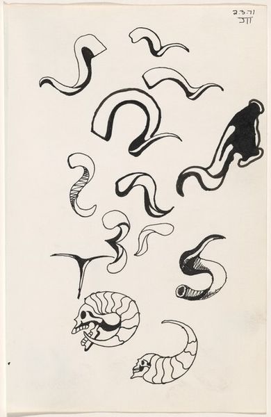 Curator: Let’s turn our attention to Mikuláš Galanda’s striking ink drawing, "Red Lips," created around 1930. Editor: Immediately, I’m struck by its dreamlike quality, almost surreal. The stark black lines against the pale paper create such a contrast and invite closer inspection. It's simple, yet deeply unsettling. Curator: Galanda, you see, was a key figure in the development of modern Slovak art. He actively sought to establish a distinctly Slovak visual language, turning to folk art and modern European movements for inspiration. His vision had a profound influence in central Europe at the time. Editor: This drawing is certainly abstracted, yet incredibly evocative. Those bold, black lips… They remind me of silent film stars, of Weimar-era decadence. There’s an air of mystery and even danger, wouldn't you agree? And this deliberate disruption of perspective makes you question traditional ideals of beauty, I find. Curator: You raise an important point. Remember, this was a time of great social upheaval, economic depression and rising political tensions, which Galanda surely felt. So his focus wasn't merely aesthetic, it was intertwined with his desire to explore new forms of expression in reaction to that turbulent world. One may say this work defies a universal message. Editor: The artist seems interested in isolating certain features—eyes, lips—reducing them to geometric forms and emphasizing their symbolic power. There’s a strong tension between representation and abstraction here. Curator: What do you make of the stars near the bottom and tear-like shapes trickling on the left of the canvas? Editor: I think those stars introduce a celestial element. But also suggest themes of performance, masquerade…as a reaction to what you mention about rising tensions at that time. As to the teardrops, a reference to sorrow or emotional exposure…The overall composition suggests a fragmented identity, viewed perhaps with pain or critical self-awareness. It invites us to think critically about visibility and vulnerability. Curator: Precisely. Galanda pushed boundaries, not just in technique, but also in addressing the cultural anxieties of his time through imagery. Editor: It’s fascinating how a seemingly simple drawing can hold so many layers of meaning, touching on themes that still resonate so profoundly today. Curator: Indeed, and "Red Lips" is just one small but representative sample of his approach to engaging the complex issues through an original visual language that transcends any historical or cultural constraint.