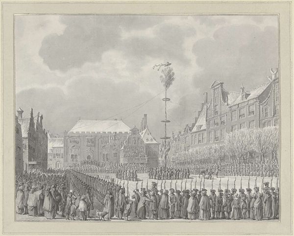 Curator: Before us we have an engraving titled "De stoet trekt over de Eenhoornsluis," dating back to 1816. The artwork captures a lively cityscape scene. Editor: My initial impression is of a tightly organized chaos, almost like a meticulously planned pandemonium rendered in very precise lines. The sheer density of figures is striking. Curator: Precisely. What we're observing is more than just a street scene. This depiction serves as a document of public spectacle and the civic life of the period. It reveals a carefully orchestrated event, potentially a royal entry or significant procession, crossing the Eenhoornsluis, which would be quite a celebrated happening in Amsterdam. Editor: The contrast between the rigidity of the architecture and the seeming animation of the crowd certainly enhances the impact. Note how the line work and perspective compress the depth, flattening the mass of humanity into the foreground and directing attention to the core figures in transit on carriages. What can you tell us about how Dutch Neoclassicism might be playing a role here? Curator: The emphasis on linear precision and clarity reflects the tenets of Neoclassicism, a deliberate return to order and reason after the Rococo period’s ornamental style. However, the dynamism and movement incorporated into the work align with the realism and detailed portrayal that depart from a strict adherence to idealization or allegory. This blend speaks to a Dutch sensibility valuing observable reality blended with aspiration towards Classical forms. Editor: Considering the era, does the imagery suggest anything about the restoration of Dutch power, or perhaps the re-establishment of societal norms? Curator: Absolutely. This period witnessed a reshaping of political structures following Napoleonic rule. Engravings like this not only recorded historical moments, they actively shaped public memory and helped solidify the ruling powers, subtly asserting order and legitimate leadership via printed images consumed widely through publications. Editor: So, by capturing this particular event, the artist participated in reinforcing a sense of continuity or even national resurgence through carefully planned compositions intended to project a desired reality? Curator: Exactly. It serves as a potent visual declaration, anchoring identity. Editor: Ultimately, a beautiful fusion of technical craft and public role! Curator: An intersection vividly displaying social spectacle and deliberate intention.