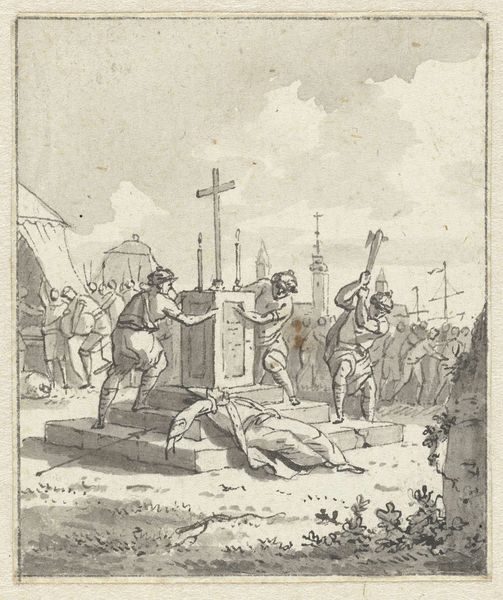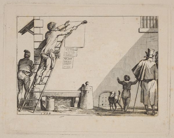 This print, titled "Satire på underofficer Sigvard Lycke," was created by an anonymous artist using etching, a printmaking technique dating back to the Middle Ages. The process involves coating a metal plate with a waxy, acid-resistant substance, then scratching an image into it. Acid then bites into the exposed metal, creating incised lines that hold ink, which is then transferred to paper. Here, the relatively fine lines convey detail and texture. The figures are sharply defined against the background, lending the scene a sense of clarity and immediacy. Prints like this one played a vital role in disseminating news and opinions. The labor-intensive etching process, combined with the printing and distribution, reflects a complex network of skilled artisans, publishers, and vendors. The satire itself suggests a critical commentary on social or political issues of the time, reflecting societal attitudes towards authority and power. This artwork offers a window into the visual culture of its time, challenging our understanding of fine art by emphasizing its connection to labor, politics, and everyday life.