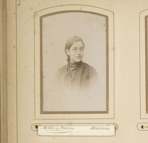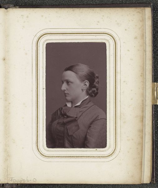 André-Adolphe-Eugène Disdéri created this portrait of a woman using the then-new medium of photography. Note how Disdéri uses soft, diffused lighting to shape the sitter's features and clothing, creating a gentle tonal range. The composition, a profile view framed within a decorative border, emphasizes the woman's delicate features. The artist captures a sense of intimacy and personal expression. The muted sepia tones evoke a nostalgic and sentimental mood. Disdéri's work must be viewed through a semiotic lens, considering the cultural codes of the time. Photography in the 19th century was more than just a recording device. It was a cultural artifact laden with meaning. Here, the subject's attire and pose signify her status and refinement. Through the lens, Disdéri captures not just an image, but a complex interplay of identity and representation. The photograph serves as both a record of an individual and a reflection of broader social values.
