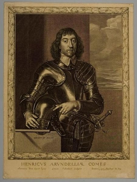 Editor: This is Anthony van Dyck’s "Portrait of a Man in Armour with Red Scarf," painted in 1627, using oil paint. The reflections in the armor are incredibly striking. How would you interpret this work purely from its visual elements? Curator: Precisely. Note how the composition hinges on a study of textures. Van Dyck masterfully juxtaposes the rigid, reflective surfaces of the armor against the softness of the sitter's hair and the implied texture of the red scarf. Observe how the light catches the high points, creating a dramatic contrast against the darker, less defined areas. This tension underscores the image’s dynamism, doesn't it? Editor: It does, though it's quite subtle. I initially thought the contrast was just between the sitter and the background. Curator: But isn't that contrast further complicated by the almost imperceptible shift between light and shadow *within* the background itself? The lack of hard edges isolates the subject, turning our attention to the material contrasts *within* the subject's own form, doesn't it? How might this contribute to the reading of the overall structure of the portrait? Editor: So, the textures define the composition, creating contrast. The dark background intensifies that. The work transcends being just a portrait. Curator: Agreed. The brushwork, particularly in rendering the armor, employs visible strokes which activate the surface, refusing illusionistic depth. The portrait then is a dialectic—a tension between representation and pure painterly construction. Editor: I hadn't considered the visible brushstrokes before; that adds a whole new dimension. Curator: Indeed. The real "subject" might be the *act* of painting itself! Editor: Thank you. Thinking about the materiality opens my eyes to new approaches when viewing art.