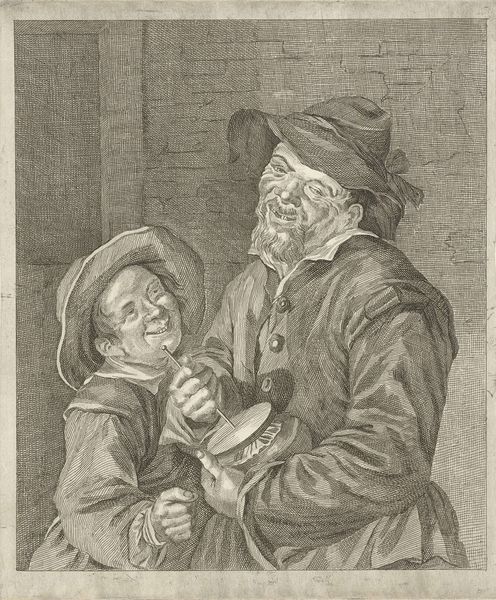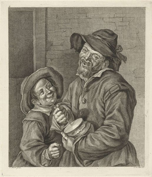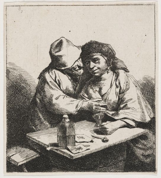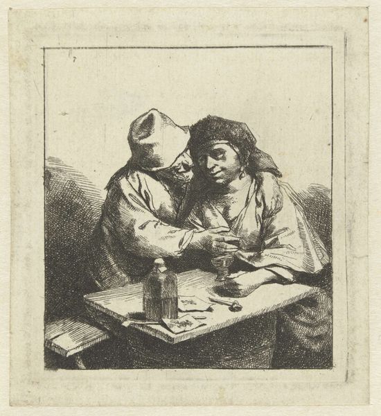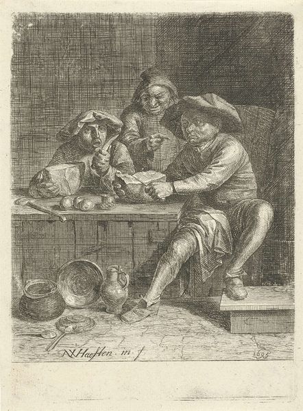 Editor: Here we have “Lezende boer,” or “Reading Farmer,” an engraving created sometime between 1600 and 1900, by Paul van B.. It’s remarkable how much detail he manages to capture with just lines. What immediately strikes me is the intensity on their faces as they examine the document. It makes me wonder what it contains that demands so much of their attention. What are your thoughts on this intriguing tableau? Curator: That’s a great question! What fascinates me is the texture. The artist's commitment to line gives depth. There's almost a vulnerability present. It's like they are sharing this private, significant moment with us, inviting us to look closer. Now, what do you imagine they are reading? Is it a letter from a loved one, or a bill from the tax collector? Editor: I’d guess a letter from a relative or a long lost love; I can’t imagine looking at a tax bill like that. But I also notice the lack of romanticism – it’s quite realistic. Curator: Precisely! It strips away idealized notions. Dutch Golden Age art does that wonderfully. These subjects reflect life for much of the population, without flourish or glamor. In your perspective, does this affect the painting’s approachability? Editor: Yes, definitely! It feels more familiar somehow, relatable in a way a grand portrait might not. Thank you. Curator: My pleasure. It is works like these that remind me how much depth and substance we can mine when we seek the sublime, not just in myth, but also in the mundane.