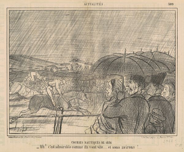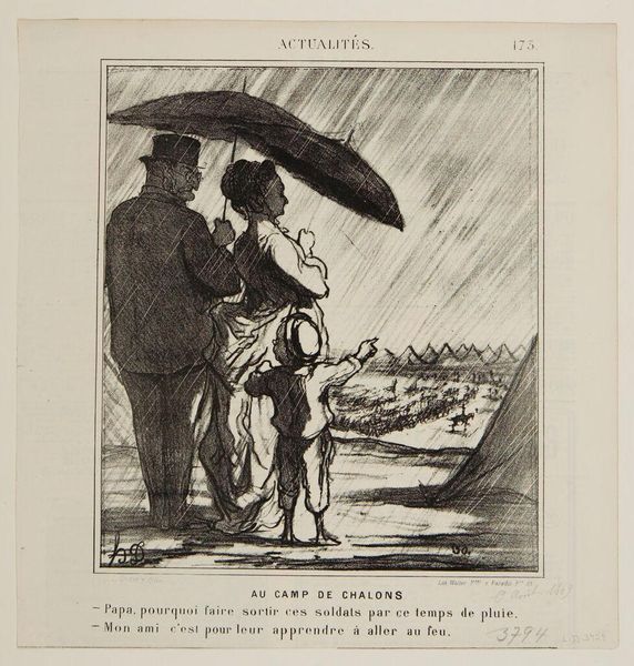 This satirical print was made by Johan Michaël Schmidt Crans in 1877 using a technique that allowed for the relatively quick reproduction of images: likely etching or engraving. The dense network of lines, defining forms and the torrential rain, demonstrates the material qualities of the printing plate. Consider the labor involved in incising these lines; the design transferred to the metal, the careful work of the engraver using specialist tools. Printmaking like this was a key technology for disseminating political messages. The image of the soldier carrying an umbrella despite regulations against it, reflects debates around military discipline. Prints such as this one existed in a wider context of labor, politics, and consumption. It is a reminder that even seemingly simple images involve complex processes and social relationships that challenge traditional distinctions between fine art and craft.