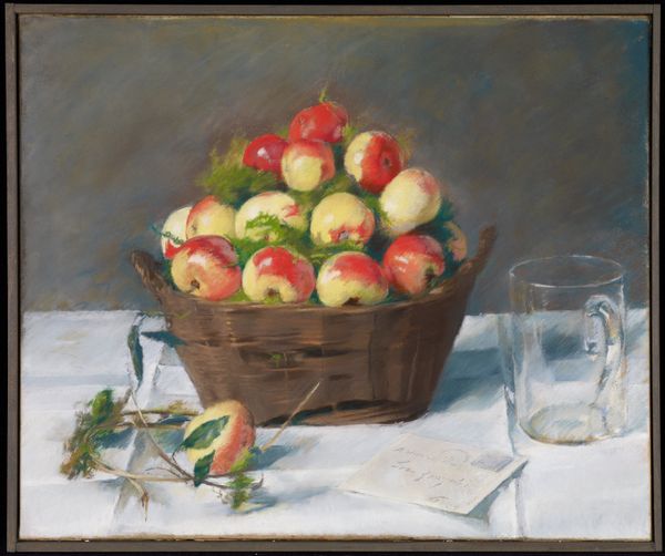 Ottilie W. Roederstein made this painting of a fruit basket against a floral wallpaper, likely in the late 19th or early 20th century. There’s something so earnest about the way she approaches the fruit and the textures of this scene. She builds up the paint in layers, especially in the floral pattern of the wallpaper. Each dab of blue seems to exist independently, yet it all comes together to create this lush surface. The basket is woven with short, choppy strokes. The green curtain is a smooth contrast. Then you get these rounded, almost geometric forms of the fruit, interrupted by confident strokes. Take a look at the apples. See the confident way the painter builds up a few strokes of red? It’s not overly blended or fussy. And I love how the white of the tablecloth isn’t just flat but has these subtle variations in tone. You can really see the hand of the artist in every part of the painting. It reminds me a bit of Morandi, someone who looked at a simple object and found a whole universe of form and color. It's not just about capturing reality, but about exploring how the paint itself can bring the world to life.