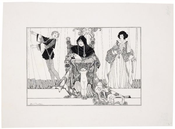 Mathieu Lauweriks created this print titled "Geblinddoekte vrouw tussen twee figuren" which translates to "Blindfolded woman between two figures". Lauweriks was working at a time of great social change, when artists were exploring new forms of expression and grappling with questions of identity and representation. This print depicts a woman, blindfolded and vulnerable, flanked by two figures who seem to hold power over her. The woman in white, with her hands upon the blindfold, suggests innocence and perhaps even manipulation. Contrasting her, is the looming figure cloaked in shadow. The work evokes questions about societal expectations placed on women, about the loss of autonomy, and the subtle but pervasive ways in which power is exerted. The print could be seen as a reflection on the ways in which women’s identities were being negotiated and contested. The work invites us to consider how traditional representations of women were being challenged and reimagined. It's a stark reminder of the constraints placed upon women.