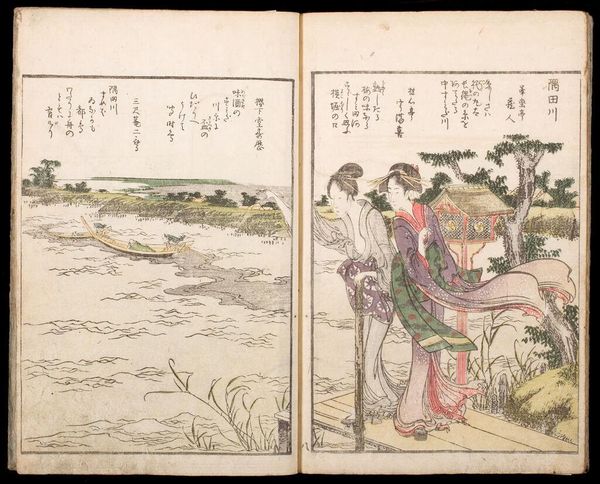 Curator: This image comes from Katsushika Hokusai's *Picture Book of Comic Poems, Mountains Upon Mountains*, one volume in a series of books by the celebrated 19th-century artist. Editor: What strikes me first is the depiction of labor—the weight these figures bear, the texture of their garments, and the tools they carry. Curator: Absolutely, and consider the context. Hokusai, living through a period of significant social and political change, presents working-class subjects navigating their daily lives. Editor: The materiality of the woodblock printing is key. Each line, each color block, speaks to the labor involved in its creation and dissemination, a real contrast with elite art forms. Curator: And it’s hard to ignore the hints of performance embedded within the narrative; the figure under the dragon costume, the musician. It adds layers of complexity to Hokusai's commentary on the human condition. Editor: For me, it’s a valuable reminder that art emerges from and speaks to the everyday struggles and joys of ordinary people. Curator: Agreed. The artwork provides an important lens through which we can view class, identity, and the performance of self in 19th-century Japan.