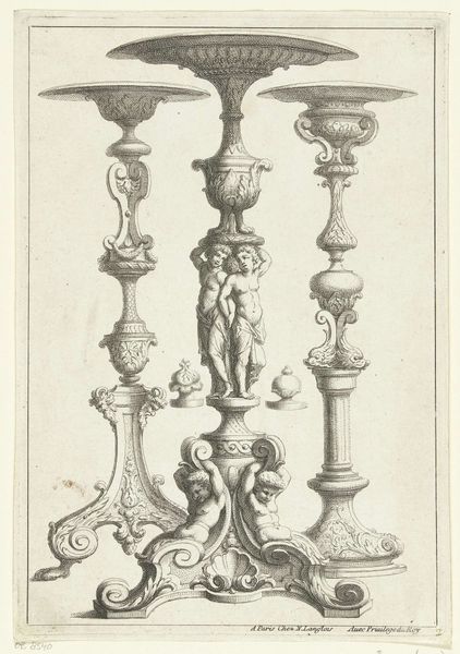 This print, made by Jean Cotelle in Paris, showcases designs for metalwork, specifically andirons - those metal supports for logs in a fireplace. The technique used here is engraving, where lines are cut into a metal plate, inked, and then printed onto paper. Notice the intricate details of the designs, from the cherubic figures to the floral garlands, and the grotesque masks. The image gives us insight into the artistic and skilled traditions required to produce luxury metalwork during that time. Prints like this one played a crucial role in disseminating designs and driving consumption. They allowed artisans and patrons to visualize and select the latest styles, influencing the production of decorative arts across Europe. The very existence of this print highlights the rising importance of design as a commodity. It reminds us that even seemingly functional objects were laden with cultural significance and symbolic value.