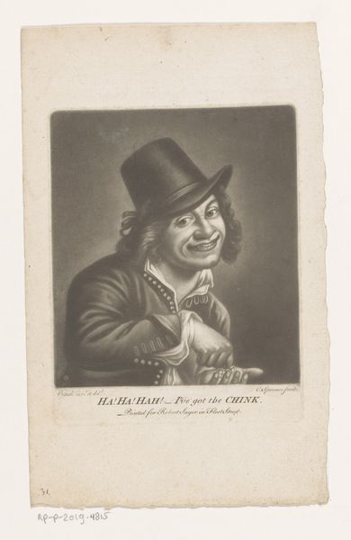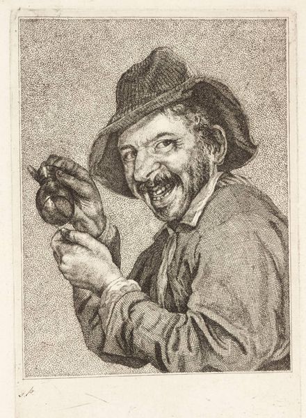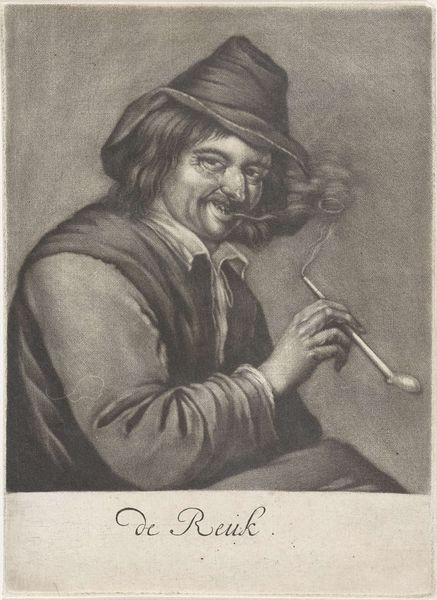 Editor: Pieter Schenk’s “Het Gehoor,” created sometime between 1670 and 1713, is a striking engraving now housed in the Rijksmuseum. The figure’s sly grin is captivating. What are your thoughts when you look at this print? Curator: The image speaks to the vibrant, and sometimes vulgar, culture of the Dutch Golden Age. Prints like these weren't just art; they were commodities, circulating widely, shaping public perceptions. Notice how the subject is rendered - his knowing gaze, the hint of a smile. Consider the implications of portraying such a figure and entitling it “Hearing” ("Het Gehoor" means The Hearing). Do you think it celebrates a specific type of listener or is more generally a social commentary? Editor: That's a great point. It’s interesting how it suggests hearing isn't just about ears, but maybe about understanding something unspoken. It makes me wonder about the audience. Was this for the wealthy, a kind of satirical peek at the lower classes, or was it popular amongst everyone? Curator: That's precisely the question. Images like these performed social work. On the one hand, it's likely wealthier buyers consumed these prints, but the imagery borrows from and feeds into popular culture. Was it seen as humor, satire, social critique? I'd say likely all of those at once, influencing public perceptions and ideas of class distinctions. Editor: So the image acts almost as a mirror, reflecting and shaping society's views. I'm starting to see how something that looks like a simple portrait holds so much more depth! Curator: Precisely! It's through this wider social and historical context that we can truly appreciate the role this type of print had in its day. I think this conversation really underscored the political work of images. Editor: Definitely. I now understand how important it is to look beyond just the art itself. Thanks for opening my ears and eyes!