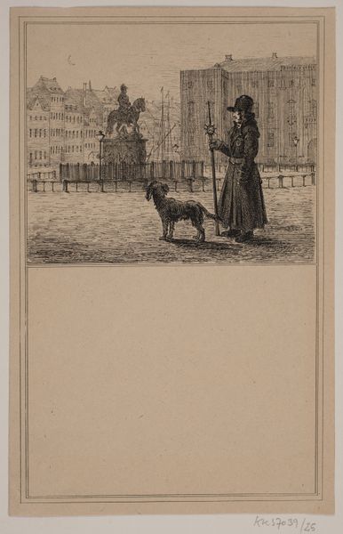 Adolph Kittendorff created this print, "Kone ved kramboden" as part of "25 Billeder for små børn." Notice how the composition is structured by linear perspective, guiding our eye from the foreground figure of a girl with a basket, towards the background details of the shop front. Kittendorff uses the sharp lines of the architecture to frame the soft curves of the girl’s form, creating a contrast that animates the scene. The texture is defined by the intricate hatching and cross-hatching, typical of printmaking, adding depth and volume. These lines aren't just descriptive; they contribute to a sense of light and shadow, defining the three-dimensional form of the girl. The blank space at the lower half serves as a structural element. The choice of such precise linework may reflect the rationalism of the period, where clarity and order were valued. Consider how this emphasis on structure invites us to interpret the scene not just as a depiction, but as a calculated construction, where each line plays a vital role in the overall harmony.