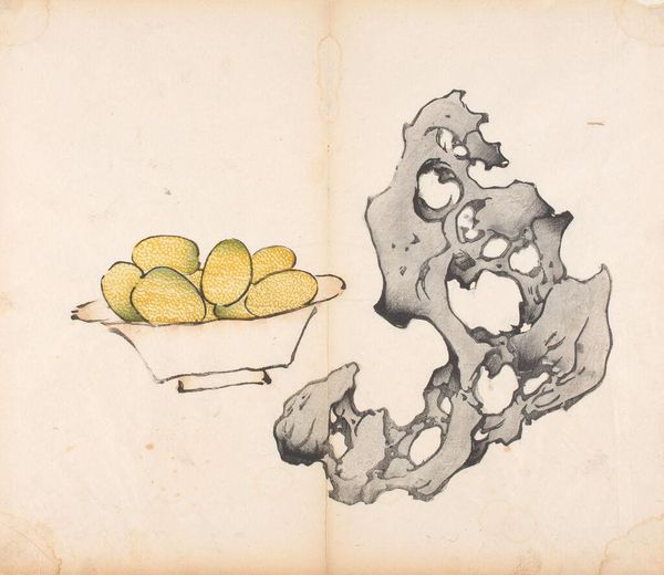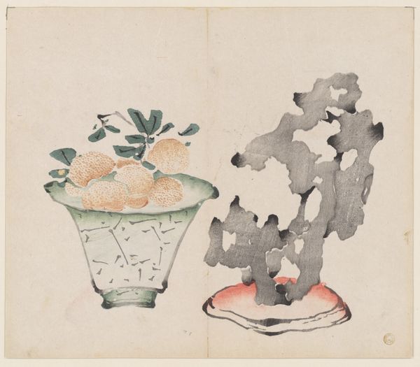 This woodblock print is a page from the Ten Bamboo Studio Manual of Painting and Calligraphy, created in China by Hu Zhengyan in the early 17th century. Here, a dish brimming with citrus fruit is juxtaposed with a scholar’s rock, both potent symbols in Chinese art. The rock, often porous and strangely shaped, embodies the Daoist principles of naturalness and spontaneity, and suggests a connection to the primordial forces of nature. We see echoes of this reverence for stone across cultures, from the ancient Greeks' sacred omphalos stones to the standing stones of Celtic traditions, each imbued with spiritual significance. The citrus fruit, suggestive of prosperity and good fortune, offers a counterpoint, hinting at the cultivated and domestic sphere. Together, these motifs speak to a harmonious balance between the wild and the cultivated, a dialogue that resonates deeply within the human psyche and resurfaces through art across millennia.