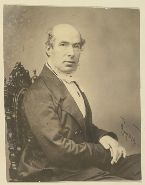 Curator: Let's turn our attention to a self-portrait by Eduard Isaac Asser, created around 1852. The title, handwritten below, reads 'Revenu a l'etat normal.' It's a daguerreotype, a very early form of photography. Editor: My first impression? Melancholy. The oval format, the soft focus… it gives him this almost lunar, floating quality. There's a delicate stillness in his gaze that's profoundly moving. Curator: Daguerreotypes, of course, have a unique presence. The image is incredibly detailed yet ethereal, almost ghostly. Asser, a lawyer by trade, was one of the first Dutch photographers. Editor: A lawyer moonlighting as a photographer! That says a lot. The way he crosses his hands... it's like he's trying to contain something. Perhaps a bit of the 'normal' he refers to in the title is that careful self-possession. Curator: It's interesting that you note the melancholic mood, I feel a controlled sadness but not completely overcome, but in light of the handwritten note at the bottom, the artist alludes to "returning to normal," potentially post some challenging times, what he thought those looked like at least. Editor: 'Returning to normal’ sounds like he has weathered something. Is there some history here that is related to that written expression? Perhaps a struggle with the artistic soul against a more prosaic profession of lawyer. You see how those stern lips have just the faintest upturn at the corner... I think I see that "artistic soul" within the image of this formal man. Curator: As a lawyer, I imagine he thought that art was one avenue into a part of life he could not approach otherwise. He uses a different part of his brain to come to his idea of normality and what should exist within that reality, or even as an ideal for himself. Perhaps through his work with art he realized more about himself. Editor: Exactly! It's like this image encapsulates a quiet personal transformation, a return maybe, but to something far more nuanced than just plain normality. It is, as he tells himself with the message included below the image. Curator: Thank you for pointing those details out! We began to appreciate Asser's vision together through the artwork itself, to think deeply of what normality may be and also how to view oneself in this world. I see something similar in his artistic efforts. Editor: And isn’t that what great art is all about, recognizing your transformation in time within it?