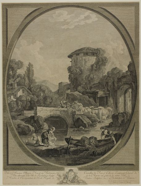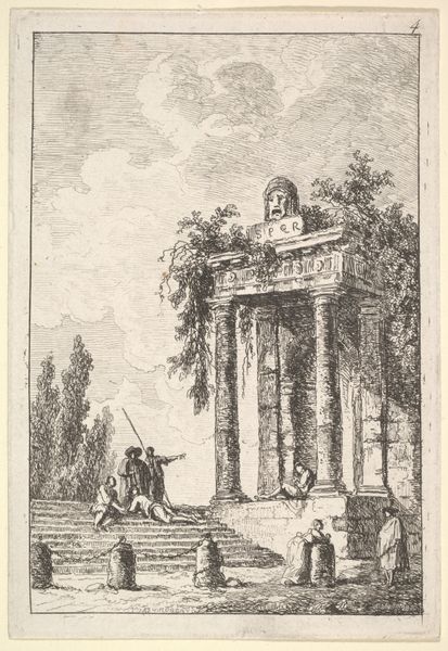 Editor: So, this is Joseph Wagner's "Landscape with Temple," an etching from around 1745-1775. The light is beautiful, really, but there's a strange melancholic feeling that the ruined architecture gives off. What do you see in this piece? Curator: I see a meditation on time and memory. Note the classical temple, meticulously rendered, yet clearly weathered. What feelings are evoked by the figures in contemporary dress dwarfed by this architectural relic? Editor: It feels like they're visitors... like we are. As though they're also contemplating the weight of history. Curator: Precisely! Wagner uses this juxtaposition to explore the persistence of cultural memory. The temple itself is a symbol, carrying echoes of past empires, philosophies, and artistic ideals. Doesn’t its crumbling state highlight the transience of even the most enduring symbols? Editor: I guess it does. Like, empires rise and fall, but the image remains... the *idea* of the temple survives. What is communicated through that contrast? Curator: That there are cyclical rhythms throughout all existence, a constant conversation between present and past. The human figures are, in a way, stand-ins for *us*. They reflect our role as both inheritors and interpreters of cultural legacies. Editor: It’s incredible to think about how much symbolism and meaning can be packed into what at first just seems like a landscape print. It's a history lesson, really. Curator: Indeed. Wagner invites us to actively participate in the continuous reconstruction of meaning embedded in such evocative imagery, engaging with the emotional resonance and intellectual weight of classical symbols across generations.