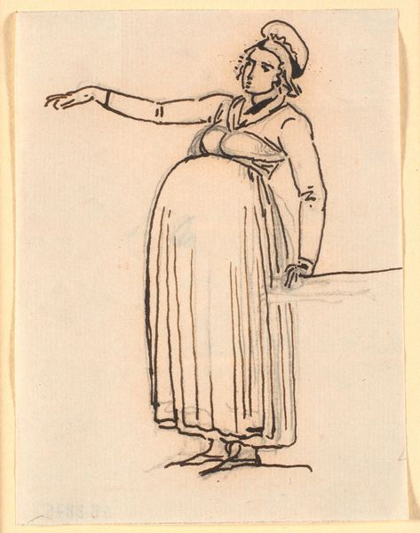 Curator: Just a few brisk strokes, and she's captured – there's something fleeting and urgent in this sketch, isn't there? Editor: Definitely. It’s a bit of a whisper, really. I find it so immediate – this quick capture feels almost like glimpsing someone out of the corner of your eye, caught in movement. Curator: Precisely. What we're looking at here is "En løbende kvinde med højre arm fremstrakt," or "A Running Woman with Right Arm Extended," a drawing by Nicolai Abildgaard from around 1786-1789. The medium is listed as drawing. It's a study, really. A thought, sketched in toned paper, light pencil work, and touches of pen-ink. Editor: You know, what strikes me is how modern it feels. The pose, the sense of motion...it could be a study for a Degas ballerina. Yet it has this classical grace as well. Curator: Abildgaard, as you know, was deeply involved in the Neoclassical movement. He's channeling ancient ideals, exploring form and dynamism, trying to embody something of Greek sculpture perhaps. It’s now part of the collection at the SMK, Statens Museum for Kunst in Copenhagen. Editor: So it's not necessarily about capturing an individual woman but more about idealizing a sense of motion and form through the body? The toned paper feels significant to this, contributing to the dream-like mood. Curator: Indeed, it is evocative. It's that sense of the ideal, that reaching towards perfection through the study of the human form in motion. Notice the arm extended—that’s pure intention, right there. What is she reaching for? Victory? Freedom? Editor: Or escaping something. I find a slight tension in her posture, as though there is great resistance that must be overcome. Whatever it is, it gives a layer of narrative to what could simply be an academic exercise. Curator: That’s exactly the thing about a study like this. It's a snapshot of an artist’s process. We, as viewers, get to join in that little secret world where ideas begin. Thank you, this makes me look at Abildgaard in a new light. Editor: A pleasure, it also makes me wonder what exactly made him chose to extend her arm the way he did. The beauty of looking at historical sketches is that you're encouraged to speculate!