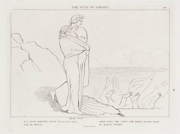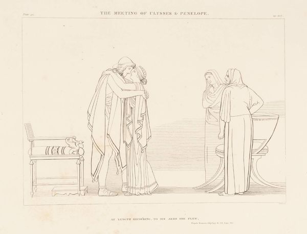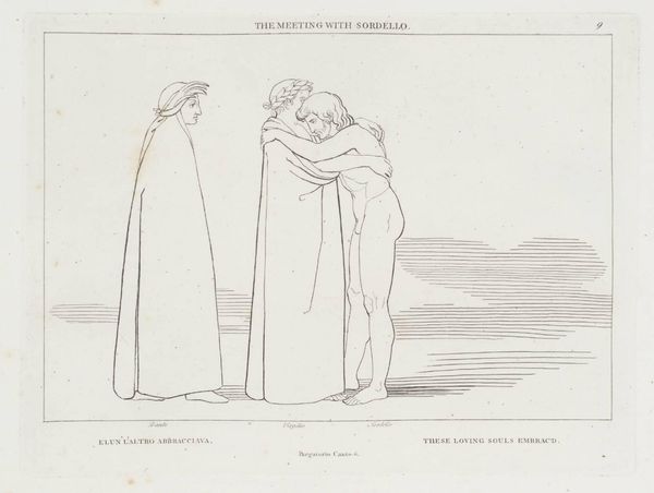 Curator: John Flaxman's delicate line drawing, "The Meeting with Statius," captures a moment of profound encounter. Editor: There's a certain austerity to it. A starkness that somehow emphasizes the solemnity of the figures and their procession. Curator: Flaxman, born in 1755, was deeply engaged with the craft of illustration, and this image is exemplary of his refined process, which involved translating literary scenes into minimalist forms, challenging established hierarchies of artistic labor. Editor: It also speaks to the power of mentorship and intellectual exchange. Depicting Dante guided by Virgil, they come across Statius, evoking themes of spiritual and creative succession that resonate with contemporary concerns surrounding influence and tradition. Who are we guided by, and who do we, in turn, uplift? Curator: Precisely. The image also emphasizes Flaxman's process as an engraver. The graphic quality of the lines, produced through craft, is a testament to the value of reproductive processes. Editor: It makes me wonder about the dynamics of power, particularly in relation to knowledge. Who has the authority to guide and interpret? What burdens of history do they carry? Curator: A pertinent observation when considering how Flaxman elevated the craft of printmaking! Editor: A fascinating intersection of artistry and social commentary, one that keeps me thinking.