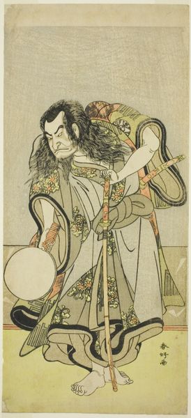 Curator: Looking at this woodblock print, what strikes me immediately is the sense of controlled power radiating from this figure. The long hair, the intensely focused gaze... It feels almost confrontational. Editor: That's a fascinating take. This is "The Actor Ichikawa Danzo IV as Shutokuin in the Play Tokimekuya O-Edo no Hatsuyuki," created around 1780 by Katsukawa Shunko. As you noticed, it’s a powerful portrait, but it also depicts a very specific performance tradition. Curator: Ah, so the actor is portraying a specific character. Is that why there is such drama, theatrical tension in the print? Tell me more! Editor: The ukiyo-e tradition elevated these depictions of popular actors. Notice the actor's imposing stance and the stylized makeup, a mask to embody the role, designed to signal specific attributes and emotions to the audience. Ukiyo-e prints of actors were like celebrity endorsements of the era! Curator: Celebrity endorsements! I love it! I imagine these prints fueled the buzz around the plays, capturing moments for fans. Still, beyond the context, it is the visual choices that move me: The subtle gradations in the robes. How they emphasize, in contrast to the severity of the face, an appealing fragility and quiet elegance. It’s like the artist has frozen a tempest. Editor: Exactly! Shunko was incredibly skilled. Look at the woodblock print technique. It involves layers of carving and printing that achieve tremendous detail and tonality, a high art and an everyday commodity. These prints democratized art, bringing it out of temples and palaces and right into people's homes. Curator: A tempest in a teacup then, a drama for the masses! It does make me wonder about Ichikawa Danzo IV, though. I hope the actor saw the print and appreciated being immortalized in such a commanding pose! Editor: It’s quite likely! His likeness ensured both enduring recognition of the artist and ongoing fame for the actor himself! It demonstrates the reciprocal relationship between art, commerce, and celebrity culture, then as now. Curator: Indeed, looking at this actor, caught in the delicate balance of stillness and tension, I find a reminder that even in the fleeting world of theatre, some moments are forever etched in time, not only in memory but also on art, for our contemplation and hopefully, pleasure! Editor: Absolutely! It gives me pause to see how the actor is placed into our sight so that we will, forever more, have the chance to think and reflect on these issues.