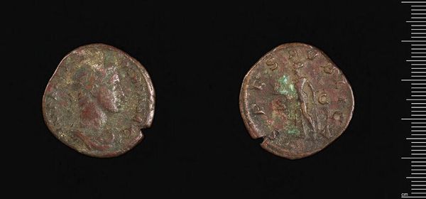 Editor: This is a coin identified as Dupondius of Commodus, from the Harvard Art Museums collection. The material seems like a weathered bronze. What do you see in this artifact? Curator: Coins often act as miniature billboards of power. Consider the image of Commodus: What does his portrait, frozen in metal, communicate about his reign, his aspirations? Editor: I hadn't considered it as propaganda, I was only seeing corrosion. Curator: It is like a dream made material, a trace of an ancient world rendered visible again. Editor: Thinking about its symbolic weight changes everything. Thanks! Curator: Indeed, objects like these invite us to contemplate the enduring power of symbols.