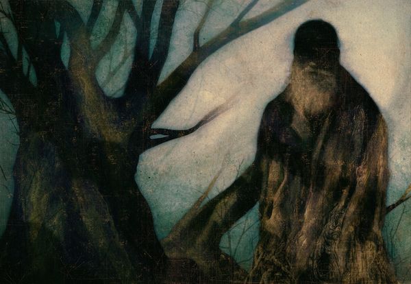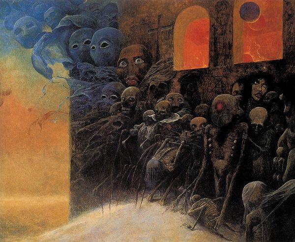 Editor: This unsettling, unnamed painting is by Zdzislaw Beksinski, created in 1973. It's an oil painting, a rather gloomy landscape with this strange, almost alien figure in the foreground. The textures seem rough, almost decayed. What strikes you most about this piece? Curator: It whispers of unease, doesn’t it? Like a forgotten nightmare clinging to the edge of waking. The palette, that burnt ochre and smoky umber, feels suffocating. It reminds me of peering into the abyss, not that cheery Nietzsche abyss, but one tinged with… well, sadness. Look how Beksinski’s figures seem trapped, emerging from the darkness, almost hesitant. What do you think they’re hesitant about? Editor: Maybe they’re afraid? There’s something vulnerable about the central figure, despite its strange form. It feels exposed, watched. Curator: Precisely! It's as if Beksinski peeled back a layer of reality and showed us something raw, primal. These paintings aren’t always about horror. They’re about a profound vulnerability that we often hide from the world, and perhaps, from ourselves. His use of texture reinforces this… you can almost feel the decay. A brave man, Beksinski. Editor: So, it's not just about scaring the viewer, but about confronting something deeper within us? Curator: Indeed. His art allows us to reflect on fear and discomfort not to paralyze but to perhaps help comprehend what we don’t understand and what we need to protect. What a great discussion; thank you! Editor: Yes, thank you! It’s shifted my perspective entirely.