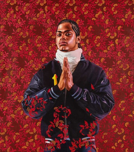 Curator: We are looking at Kehinde Wiley's striking portrait, "Morthyn Brito," completed in 2012. It's a mixed-media piece with a distinct layering of textures and patterns. Editor: My immediate reaction is of boldness and defiance—a contemporary subject presented with undeniable regal presence despite the inherent chaos of the composition. Curator: The composition is quite calculated, actually. Notice how the figure is centrally positioned, allowing for a direct engagement with the viewer. Wiley expertly balances realism in the portraiture with the almost overwhelming floral backdrop, pushing against the established conventions of the portrait genre. Editor: I agree, there’s definitely control. However, I read this painting as directly confronting art historical exclusion. Wiley reclaims and repurposes traditional European portraiture, embedding young Black men within these spaces as both subjects and active agents. This subverts those classic ideals and disrupts power dynamics. Curator: Absolutely. There's a clever dialogue happening between the subject’s contemporary clothing and the opulent, historical aesthetic, but note also how Wiley utilizes a flattened perspective—almost pop-art-like. The high-key colors and repetitive patterns eliminate depth, forcing us to consider the surface qualities, and the artifice itself. Editor: Precisely. The layering you described goes beyond mere texture. It’s about complex identities. He invites conversations about cultural appropriation and the construction of masculinity. Look at the patterned jacket as an expression of diasporic aesthetics. It asks who is deemed worthy of memorialization in art. Curator: Considering all those dimensions makes for such a visually dense and conceptually challenging work of art. Editor: Exactly, It becomes a testament to how identity is both performed and shaped by history and social forces. These visual statements can reshape public perceptions, offering powerful affirmations.