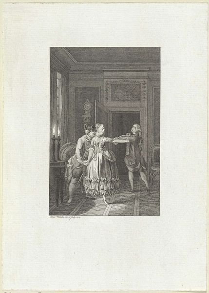 This is Reinier Vinkeles’ ‘Nocturnal Encounter by the Light of an Oil Lamp’, a print housed here at the Rijksmuseum. The scene is illuminated by the soft glow of an oil lamp, and the central figures are locked in a clandestine embrace. Consider the lamp itself. Light, since antiquity, has symbolized knowledge and divine presence, yet here, it casts shadows, suggesting secrecy and hidden desires. Notice the man’s gesture as he pulls the woman close, echoing classical depictions of abduction, like Persephone by Hades, yet in this context, is it coercion or mutual passion? The chaperone, a silent witness, adds a layer of psychological complexity: is she condoning or disapproving? Such encounters, cloaked in darkness, recur throughout art history, from medieval romances to 19th-century dramas. What Freud might call the return of the repressed, the human subconscious drawn to forbidden unions, forever finding new expression. Vinkeles captures not just a moment, but an archetypal scene, forever imprinted in our collective memory.