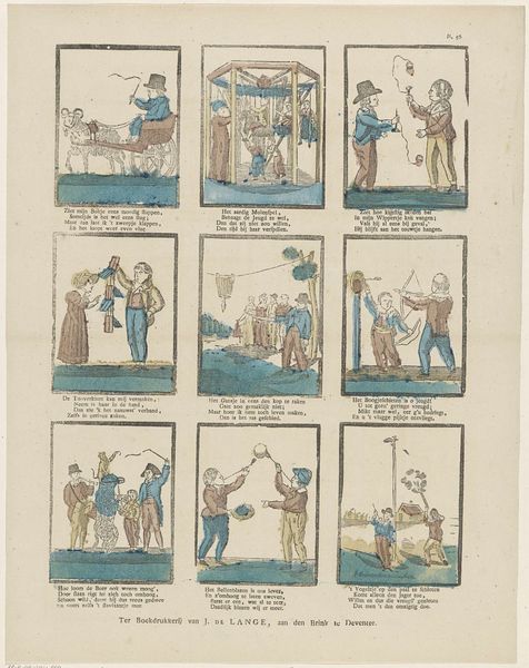 Editor: Here we have "Figuren en bezigheden," or "Figures and Activities," an etching on paper made sometime between 1828 and 1849. It almost looks like an early comic strip with all these little scenes! What can you tell us about the socio-historical context surrounding this print? Curator: This print provides a fascinating glimpse into everyday life in the Netherlands during the first half of the 19th century, a time of significant social and political change following the Napoleonic era. Prints like these served as a popular form of entertainment and communication, circulating widely amongst different social classes. How do you think its distribution impacted society? Editor: Well, the fact that they were distributed so widely must have meant the imagery influenced people's perceptions and understandings of the world. The subjects in the various scenes seem pretty mundane… Curator: Exactly! And that mundanity is key. They often presented idealized or humorous depictions of daily routines, social interactions, and moral lessons, reinforcing certain societal norms and values. Notice the inscription at the bottom; these were sold by Erve Wijsmuller, so we can infer a specific intent in disseminating particular messages. Do the themes resonate at all today, nearly two centuries later? Editor: I suppose we can still relate to depictions of socializing and even minor domestic squabbles! So this print offers a lens to examine the shared human experiences of the time? Curator: Precisely. And by studying these "Figures and Activities," we gain insight into how cultural values were propagated and consumed within Dutch society. Plus it also reveals what the average person may find relatable even now. Editor: I never thought about prints having such cultural impact before. I appreciate learning the function that art has. Curator: Likewise. These historical "snapshots" truly enhance my perspective about public art in society.