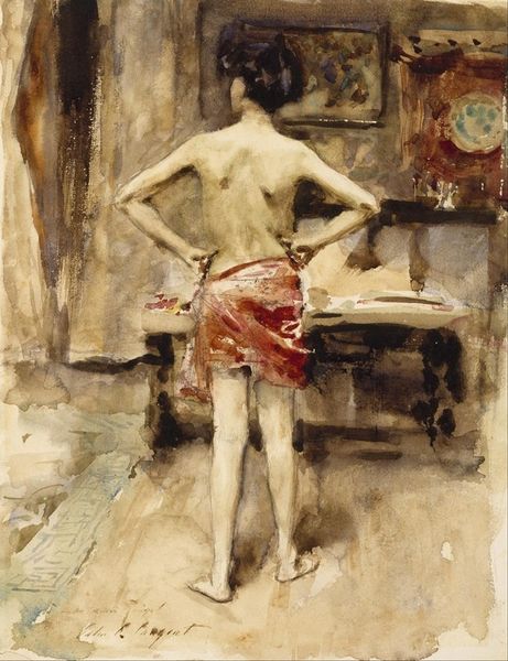 Mariano Fortuny Marsal created this sketch of a "Half-naked man" during the 19th century, a time when European art was deeply engaged with themes of orientalism. This piece, with its loose brushwork and intimate portrayal of a male figure, disrupts the traditional, often exoticized, depictions of North African men common in European art of the period. Instead, Fortuny offers a more vulnerable and immediate representation, seemingly stripping away layers of cultural and social distance. The man's posture and the stark setting evoke a sense of isolation, inviting us to consider the human experience beyond the surface. Fortuny himself had a close relationship with North Africa; he lived in Morocco, where he immersed himself in the local culture. He stated that “he was born to paint the light and colours of Arabia.” This context encourages us to reflect on the complexities of cultural exchange and representation, and the emotional dimensions of identity and place.
