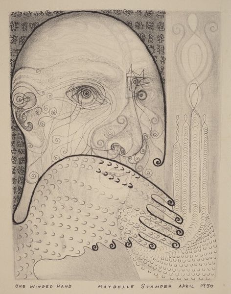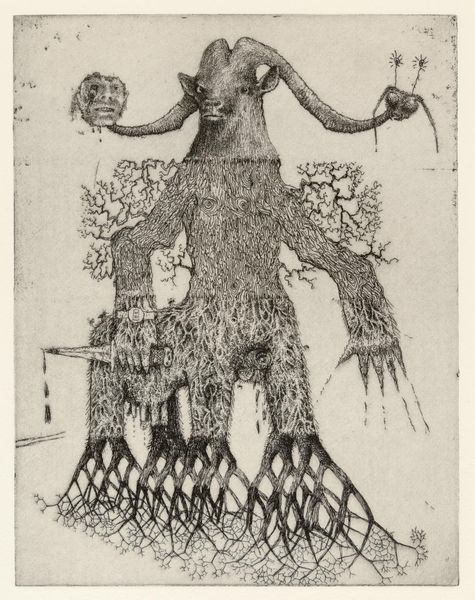 Editor: Here we have Hana Čapová's "Under the Veil of Night," a print from 1987 using the etching technique. It strikes me as quite unsettling – this mesh of realism and bizarre, almost nightmarish, figuration. What do you see in this piece, in terms of how it evokes this particular mood? Curator: Oh, it whispers to me of half-forgotten dreams and anxieties. See how Čapová uses that intense line work? It's like cobwebs, clinging to our subconscious. The veiled woman feels trapped, observed perhaps. I imagine her caught between societal expectations – that net – and her own inner desires, represented by the surreal, almost grotesque, figures surrounding her. Do you get that sense of unease from the distorted proportions? Editor: I do now! The long nose, the dark hand...it’s all a bit off-kilter. Is it me, or are those scissors threatening? Curator: I'd say it is deliberate, to signal at the tensions lurking just beneath the surface. Those shears poised to snip… could represent cutting ties, liberation, or even castration anxiety. But there's a tender beauty here, too. Look at the intricacy of the veil, the delicate lines of the woman’s profile. It's like she's both vulnerable and fiercely resilient. It almost feels like something Louise Bourgeois could've dreamed up, but distinctly Čapová's voice. It's amazing how this style walks that fine line. Editor: So, the unsettling nature really speaks to a deeper tension between internal feelings and external expectations… Curator: Precisely! I find myself returning to the woman's expression – she almost invites us into that complex internal world of hers, even knowing the discomfort that may arise. The artwork demands bravery, for the artist, and the viewer, and I love that! Editor: I see what you mean. Thanks. Now it seems more poignant.