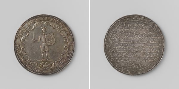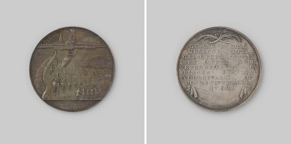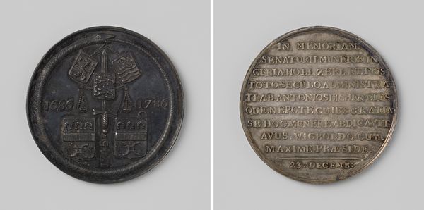Curator: Well, here we have an engraving dating back to 1768, currently residing in the Rijksmuseum. It commemorates B. van Nes, specifically celebrating his fifty years as a schout and secretary across several locations. Editor: My first impression is somber, almost melancholic. The detailed text on one side contrasts sharply with the rather bleak scene on the other—a landscape dominated by what appears to be a fallen tree and fragmented structures. It speaks to a certain…impermanence. Curator: The imagery is fascinating when we unpack the symbolism within that landscape. Notice how the fallen tree and the broken wheel alongside "GOD HEEFT HET L. GEZEEGEND," implying God has blessed it. Perhaps, these symbols evoke both resilience and divine providence amid worldly transience. Editor: Right, and the text—almost a dedication, serves a very public function, right? It marks and celebrates van Nes' long tenure, thus solidifying his place within the local historical narrative. So, beyond the religious elements, you see a more pragmatic aspect. Curator: I absolutely do, and this also offers layers to think about concerning local politics. How, by connecting him to divine blessing, that very position itself, beyond the individual office holder, might itself be further endowed with authority. Editor: Hmm, do you think there’s also a contrast happening in the very making of this item? I mean the durable, cold, metallic material feels contradictory alongside themes like blessing, providence, decline or the passage of time, which would be better conveyed in a drawing perhaps, no? Curator: Maybe that contradiction you see helps reinforce how public memory gets shaped. Consider how the longevity and permanence of the engraving might serve as its own metaphor. Think of an emblem. Editor: Yes. One way of looking at the making of the symbolic and literal meaning of a very prominent local figure, the values which underpin that kind of position and that specific place in history. That is not, it seems to me, just a happy chance of time... Curator: So in that light it can almost be considered as a Baroque artifact, one that uses emotional messaging, bold statements and a bit of rhetorical showmanship, though adapted to the medium of engraving and this context in 18th century Netherlands! Editor: Well, thank you, I have some ideas on the politics of imagery at play in eighteenth-century Haarlem, hopefully to carry me forwards. Curator: Likewise. It will continue to add dimensions to how I perceive symbols of perseverance, I think.