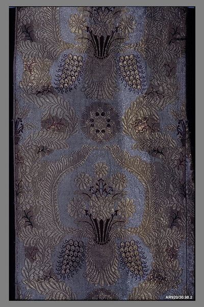 Using historical design motifs as inspiration for contemporary expression is an age-old practice. The 19th century designers who created this fabric were inspired by the bold, baroque designs of the 18th century. This particular velvet is made up of a central panel and two border panels. The units, designed to complement each other, were made so they could accommodate a variety of room configurations.