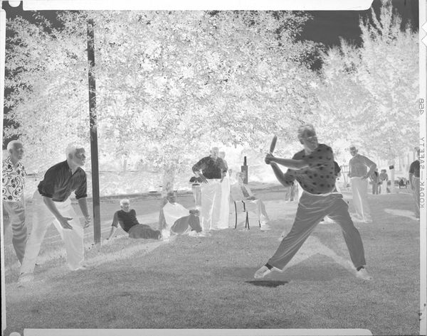 Editor: Here we have an untitled photograph by Jack Gould, showing Stan Musial in action. The negative image gives it this ghostly, dreamlike quality. What strikes you about it? Curator: It's like a memory, isn't it? The reversed tones make us see the familiar in an unfamiliar way. I feel the crack of the bat, the tension, suspended in this strange light. Editor: It almost feels like a glimpse into a different dimension. Curator: Exactly. And that's the power of the photograph, isn't it? To hold a moment, but also to transform it. Makes you wonder about all the other moments, lost or remembered. Editor: I see what you mean, I never looked at it that way before. Curator: Neither did I, until just now.