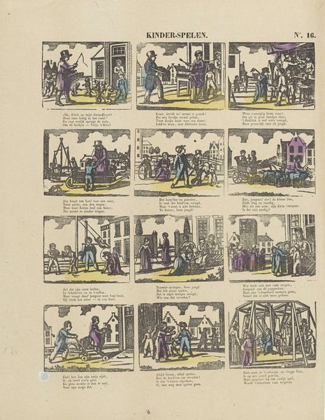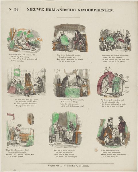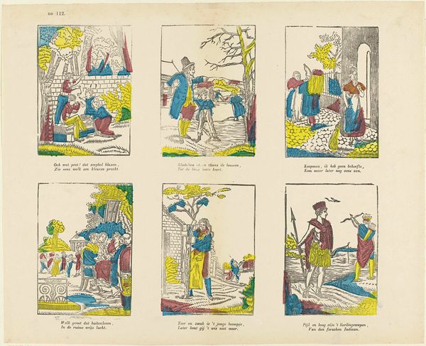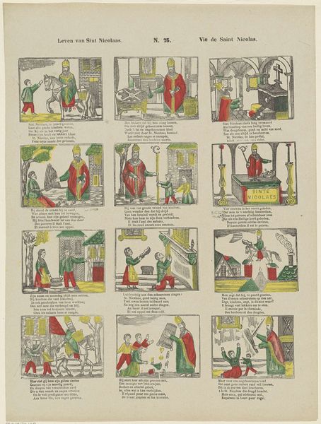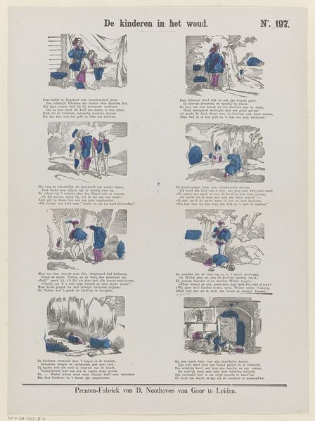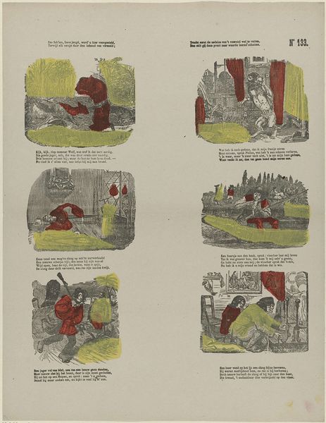 Editor: So, this delightful piece is called "Roodkapje en Klein Duimpje," dating somewhere between 1848 and 1881, made by Lutkie & Cranenburg. It looks like a colourful storyboard for those two fairy tales, Little Red Riding Hood and Tom Thumb. The way the scenes are laid out reminds me of a comic strip, though more antiquated. I'm curious, what's your take on it? What do you see here? Curator: Well, you're right, it’s utterly charming! This print, probably a woodcut, feels less like high art and more like something delightfully functional. Imagine it – pinned up in a child’s bedroom, prompting imaginative play and storytelling. It almost vibrates with a naivete and playful energy. Lutkie & Cranenburg weren't trying to create high art, more to sell something to kids...but this piece offers the sense of childlike wonder for sure. It’s a wonderful lens through which to observe how society taught children at the time. Each scene condenses complex narratives, leaving the viewer to fill in the gaps – which could inspire the child to learn reading from the illustrated stories! What do you think about that visual shorthand? Editor: That’s interesting! I hadn’t considered the educational aspect. I was more focused on how sweet the little scenes looked but thinking about that makes it even sweeter. Curator: It’s amazing how something that seems simple can be so layered with meaning. Makes you wonder what they might have cut out to streamline the tales, eh? Editor: Exactly. It makes you want to delve deeper into these fairytale-inspired images!
