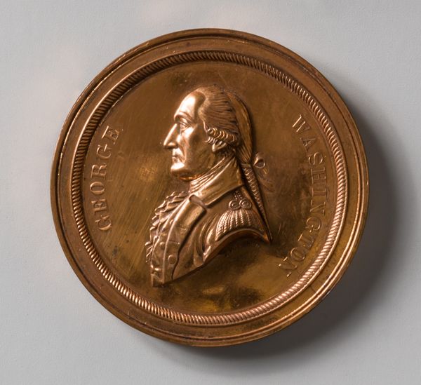 Editor: This is the "Medal of John Paul Jones and the Serapis," a bronze relief created in 1779 by Augustin Dupré. The crispness of the lines and the perfect circle are striking, but the real focal point is the meticulously rendered portrait. What do you make of it? Curator: Indeed, the formal elements are paramount. The artist employs the conventions of Neoclassicism – observe the clean lines, the emphasis on rationality and order, all contained within the circumscribed shape. The relief itself utilizes a very shallow depth, prioritizing line over volume to create the image. Notice the incised inscription around the perimeter? How does its linear form interact with the central figure? Editor: It seems to frame him, highlighting his importance while creating a sense of containment and controlled power. The inscription also appears to be carefully spaced, adding to the sense of order. Curator: Precisely. And what does the material, bronze, contribute to the work's overall impact? Consider its inherent qualities. Editor: Well, the bronze gives it a sense of permanence and authority. The reflective surface catches the light, creating subtle shifts in tone that accentuate the contours of Jones' face. Is it supposed to function almost as a mirror, a way for the viewer to reflect on heroism and leadership? Curator: That's a compelling interpretation. We might also note how the reflective qualities change depending on the angle of incidence and the observer's viewpoint in relation to the artwork itself. In sum, Dupré masterfully manipulated form and material to elevate Jones into a figure of enduring significance. Editor: I see that it is how the form gives meaning. That’s a new angle of looking at a portrait for me!