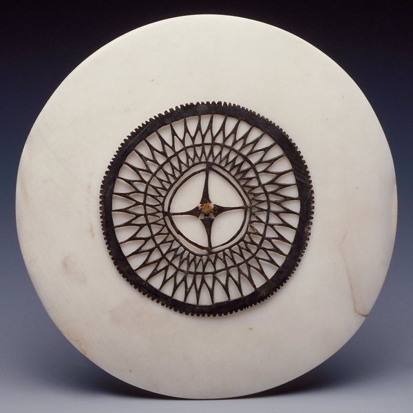 Curator: Immediately, I'm struck by the overall radiant quality of this gold breast plaque. Its smooth, reflective surface is so alluring. Editor: Indeed, it possesses a captivating luminescence. This gold relief sculpture, known as a Breast Plaque, originates from the Veraguas peoples between the 9th and 15th centuries. Today, it resides here at the Minneapolis Institute of Art. Let's delve into what this piece communicates about its context. Curator: I'm most interested in how the interplay of rounded forms contributes to a harmonious balance. Note the concentric rings that cascade from the central boss. What figure do you see in the center? Editor: If we look closely, we can see a human figure that’s potentially understood to be androgynous, lying on their back. When discussing gender in a pre-colonial context, we must consider fluidity beyond the binary. This form of leadership perhaps embodies male and female energies in one powerful being. The application of lost wax casting, in this instance, gives clues to ancient metal-smithing methods used in present-day Panama. Curator: Its production surely held enormous cultural weight. Metalwork held a prestigious place in society at the time. But if we look closer, what can the details along the edges suggest to us? Editor: Those tiny repetitive shapes almost mimic beads, so the effect certainly borders on the ornamental, something not reserved simply for functional value, as an addition it acts as its own agent. Such careful ornamentation elevates its value, underscoring the leader’s status, and could have even facilitated certain types of social discourse during wear. Curator: Absolutely, its role goes far beyond mere decoration. What do you feel examining it? Editor: Its warm tone feels somehow hopeful despite its obscured meaning. What’s been particularly enlightening for me has been reflecting on this breastplate's visual balance as it relates to possible concepts of androgyny. Curator: And for me, it’s this reflection on indigenous cultural sophistication, far beyond the often oversimplified accounts presented in popular culture, that remains most fascinating.