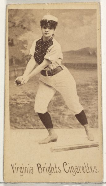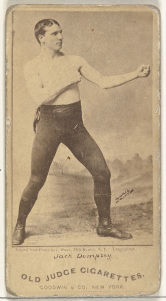 Curator: Oh, this gelatin silver print! It’s called "George Godfrey, from the Celebrities and Prizefighters series" by Goodwin & Company, dating back to 1887-88. It was actually part of a series included in Gypsy Queen Cigarettes packs. Editor: Immediately, I'm struck by the tonal range—those velvety dark trousers contrasting against the stark white socks. And the man's gaze; so direct, almost challenging. It’s surprisingly intimate for a commercial print. Curator: The composition really centers on his physique. He's presented as this sort of masculine ideal, which aligns with the cultural emphasis on physical prowess at the time. You see this in other genre paintings too. Editor: Indeed. And note the background, an out-of-focus haze suggesting some nonspecific landscape. This allows Godfrey to powerfully dominate the frame, transforming him into a cultural symbol. A study of textures – the softness of the backdrop plays against the hardness of his gaze, really highlighting the semiotics of masculinity. Curator: Exactly. These trading cards became pocket-sized shrines to celebrity. Think about how widely distributed these images were. They ended up shaping perceptions. The inclusion in cigarette packs links this “ideal” of Godfrey with consumption, desire. It’s all intertwined, isn't it? I bet folks didn't imagine we would be analyzing these little artifacts so deeply a century later. Editor: The formal choices really do elevate him. While the image functions on a commercial level, consider that tonal range and dynamic composition—this small object resonates well beyond its original intent. A perfect capsule for visual codes that spoke to aspiration, strength, and perhaps even rebellion. Curator: Well, it makes you think about how we create our own idols today, doesn't it? And the formats we use to keep their image close. Editor: Absolutely. A small cardboard picture of the late 19th century speaks to our digitally mediated world and the way we idolize still today.
