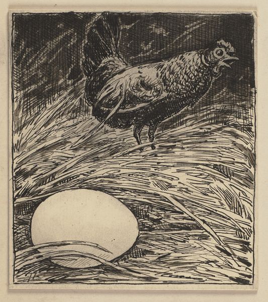 Curator: Immediately striking. The muted colors give it such a quiet, unsettling atmosphere, even though it's an illustration for a children's book. Editor: It's more than an illustration, it's a portal, isn't it? This piece is one of a series created around 1910 by Heorhiy Narbut for 'How mice buried the cat' by Zhukovsky. There are nods to traditional styles such as ukiyo-e, which he was fascinated with. Look how he turns this folk tale into something steeped in a very clever form of symbolism. Curator: I see what you mean about the ukiyo-e influence, definitely. The perspective is a bit wonky, which contributes to that unsettling feeling I got. And yet, it's a rather amusing scene—mice holding a funeral for a cat while a large rooster looks on. What's the underlying feeling there, do you think? Editor: Well, the rooster is an ancient symbol, and one can not easily detach that representation of pride, power, even resurrection depending on the culture. Given that context, its scale, standing in what almost appears to be a lake. Its very presence here, observing this whole spectacle, emphasizes the transience and reversals of power. The small triumphant over the large and expected order. Curator: Power reversals...the mice getting the upper hand on the cat. Yes! I get it. But then what is the significance of the cat sitting right there above on a ledge, completely alive? Editor: That is interesting to note... Perhaps that means what has occurred can’t simply erase its significance... and memory persists—haunting their supposed victory? The dream or the wish becoming briefly realized while facing truth's silent reminder of the past reality? Curator: So, it is not just a funny children’s story after all, but a subtle lesson about the temporary nature of power and the persistence of memory, told through the quirky filter of a truly unique artistic vision. Amazing. I have never seen a children’s illustration make such a striking symbolic commentary! Editor: Exactly. Next time you meet with an artwork, remember that images speak beyond surface-level entertainment or utility. Dig a little and you'll be surprised!