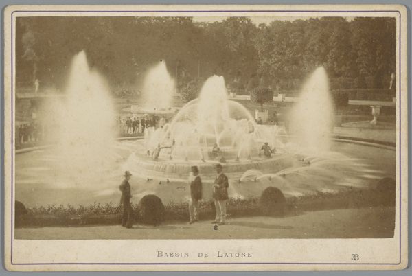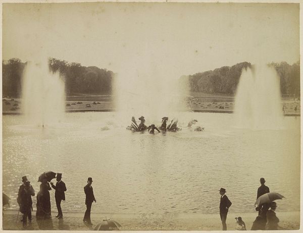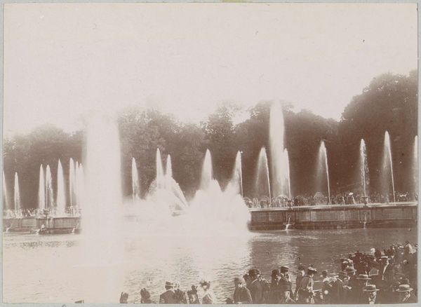 This gelatin silver print shows the fountains at Versailles surrounded by an assembled public. The photograph is structured by a clear horizontal division between the earthbound figures and the ascending water jets, with the dark mass of trees in the background establishing depth. The visual impact arises from the contrast between the solid, static forms of the crowd and the fluid, dynamic spray of the fountains. The sepia tone flattens the details, emphasizing the texture and tonal variations rather than specific colors. This juxtaposition creates a semiotic tension: the rigid social order of the viewers against the ephemeral, almost chaotic, display of water. The photograph’s composition evokes questions about the role of spectacle and its consumption by the public. The fountains, symbols of aristocratic power, are now a backdrop for public leisure, suggesting a shift in cultural values and access. The very act of capturing this scene on photographic film challenges fixed meanings and invites ongoing interpretations of space and representation.