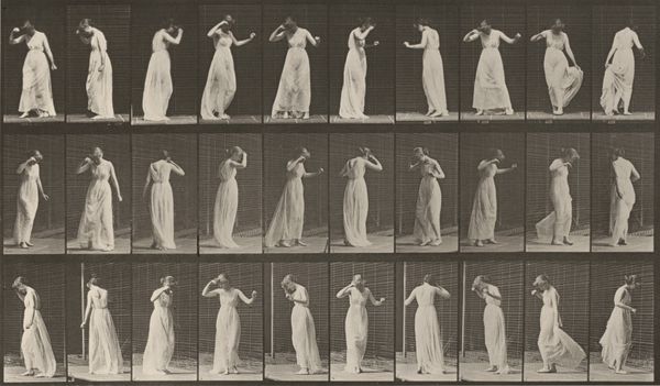 Editor: We’re looking at "Plate Number 188. Dancing (fancy)" by Eadweard Muybridge, a gelatin silver print from 1887. The sequence of images, capturing a woman in motion, has a somewhat ethereal, almost ghostly quality, don't you think? It's like she's a spirit caught between frames. What do you see when you look at this piece? Curator: Ghostly is a good word! It reminds me a bit of a Victorian spirit photograph, ironically capturing what’s fleeting and ephemeral with this very modern technique. He was obsessed with stopping time and revealing what the human eye couldn't normally see! You could spend hours contemplating the different layers; technical wizardry combined with a fascination for movement, but also something melancholy – the sense of a performance, endlessly repeated for our consumption. Does the "fancy" dancing appear constrained in that grid format, do you think? Editor: Absolutely. I get this feeling of almost scientific detachment from the dance itself. Was he really interested in the art of dance or was it a subject to be studied? Curator: Oh, both, I think! Think of it like plucking a flower: part admiration, part examination, irrevocably altering the object of affection by dissecting it. He loved art, too, which makes the experiment even more fascinating. Don't you find his process beautiful and brutal at the same time? Editor: It's a strange paradox. I appreciate that you brought up the beauty in the experiment! Curator: Precisely! It’s those messy contradictions that makes this image so intriguing, even now. Editor: Definitely gives you a lot to think about beyond the surface. Curator: Precisely the dance with meaning!