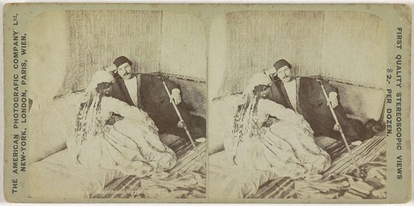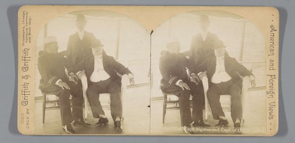 Editor: Here we have "Man met telefoon" from 1897 by William Herman Rau. It's a photograph, likely a daguerreotype. What strikes me is how posed and staged it feels. It is clearly not just a snapshot. What can you tell me about it? Curator: This is fascinating as a record of early telephone technology within a specific social stratum. Consider the materials – the polished wood of the telephone, the gentleman's suit, the opulent armchair, even the cardstock it’s printed on. These all speak to a level of affluence and access. How might the telephone, as a commodity, reinforce existing power structures of that era? Editor: I guess the telephone wouldn't be for everyone, only for those with the financial resources. And his pose seems a bit like an advertisement, too. Curator: Precisely. Notice how the photograph is also a product, meant for mass consumption and distribution as indicated by the text that reads: "SOLD ONLY BY Griffith & Griffith" on its left. It invites us to consider photography not only as an art form but also as a manufacturing process subject to capitalism and commodification, distributed as "American and Foreign Views". It says a lot about labour practices. Does the telephone, as a technological tool, seem to democratize communication, or simply extend the reach of established elites? Editor: That’s a really interesting point. I hadn't considered how the means of production shaped even a simple portrait like this. The materiality really changes how I read the image. Curator: It underscores the intricate relationships between art, material culture, and socio-economic forces at play during that era. Perhaps reflecting on that has enabled you to engage the viewer with a more critical approach. Editor: It definitely has! I'll certainly look at early photographs in a different light from now on!