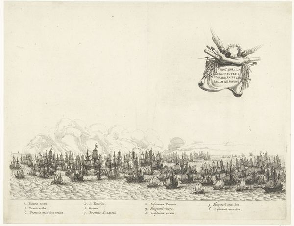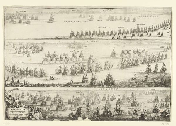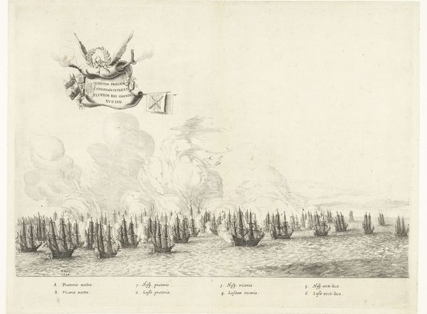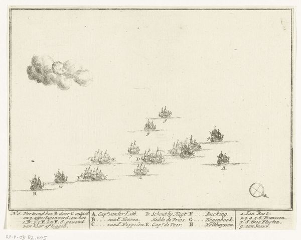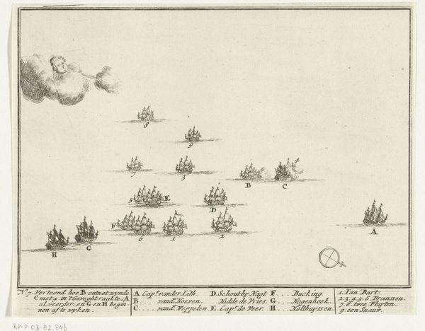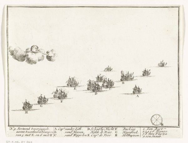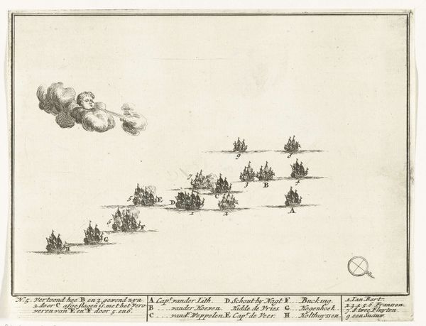 Adriaen Schoonebeek created this print, "Sea Battle between the Dutch and French in the North Sea," around 1694. Its composition is dominated by a vast expanse of sea and sky, punctuated by the ordered arrangement of ships. The etching's formal structure creates a sense of strategic calculation, a game played on the sea where each ship's position is significant. The lines are crisp and precise, detailing the rigging and sails, while the ships are organized in relation to each other, suggesting a choreography of naval engagement. Note the cartographic elements, such as the compass rose and lettered annotations, which transform the scene into a kind of informational diagram. Schoonebeek presents the battle as an exercise in rationality, a calculated interplay of forces. In doing so, the print challenges any heroic narrative of naval conflict by reducing it to a play of signs, a semiotic representation of power and strategy.