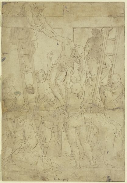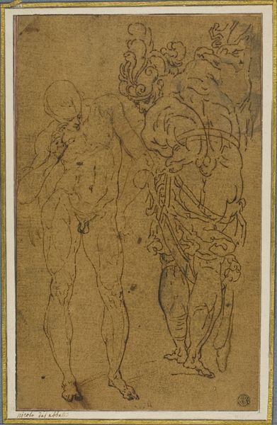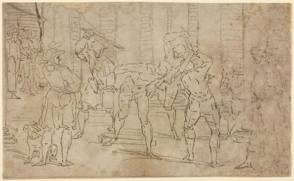 Curator: Looking at this artwork, I immediately feel a sense of vulnerability amidst violence. The delicate lines of the ink contrast sharply with the brutal scene depicted. Editor: This is an anonymous piece titled “Martyrdom of Saint Sebastian with Two Archers”, created between 1470 and 1480 during the Italian Renaissance. Currently, it resides at the Metropolitan Museum of Art in New York. It is rendered using pen and ink. What's interesting about it is its reflection of shifting power dynamics and social values of the time. Curator: Exactly. The martyrdom of Saint Sebastian, historically depicted as physical endurance in the face of oppression, has implications for queer identity studies too, considering that interpretations frame the image through lenses of desire and the erotic. The archers' expressions – or lack thereof – also adds a layer to consider. Editor: Right, the saint became an important figure during the plagues that ravaged Europe in the 15th century. What do you think the presence of the two archers reveals about attitudes toward persecution and perhaps even state power in that era? Are they instruments of a just authority or cruel, indifferent enforcers? Curator: That’s it. This portrayal emphasizes the psychological burden of enacting violence, perhaps suggesting an unease with power that's relevant today. How does this narrative connect to our ongoing societal conversations around who gets remembered and why? Editor: By examining the artwork through the lens of its socio-historical background, it invites viewers to re-evaluate how societal narratives, power and resilience have played out, in this image and more broadly, and continue to impact the reception and creation of art today. Curator: Ultimately, what's striking is that even in this supposed moment of ultimate sacrifice, Sebastian's posture feels oddly defiant, questioning the terms and the ethics of violence, raising awareness on current affairs about victim blaming, for example. Editor: I think exploring these complexities reminds us how the past still reverberates in our present moment, challenging us to create a future society free from similar persecutions.