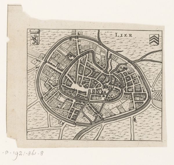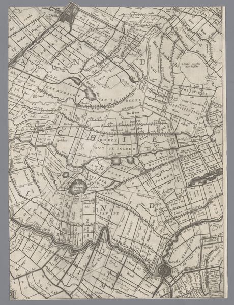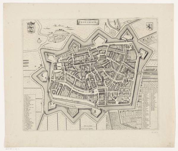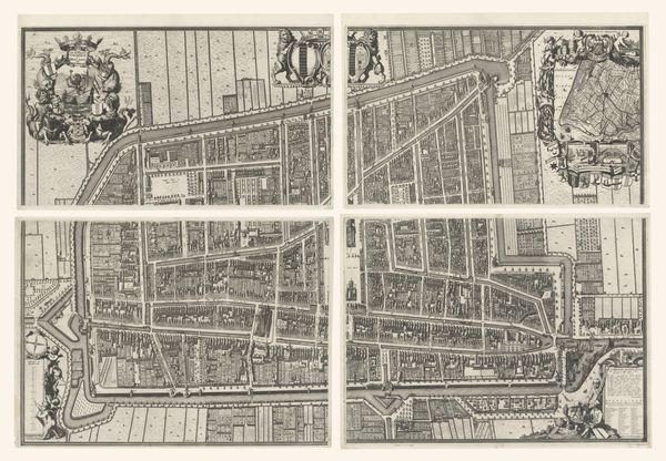Editor: This is an intriguing piece—a plan of Leiden in four parts, made after 1675 by Christiaan Hagen, rendered as a print using engraving and ink. It reminds me of something that would be consulted more as a technical document than a work of art, though its creation must have taken artistry and precision. How do we approach a piece like this as art, and what can you tell me about it? Curator: From a materialist perspective, consider the engraving process. The creation of multiple identical images democratized access to information about Leiden, shifting the control of knowledge. The physical act of engraving – the labor involved – directly shaped the accessibility and distribution of this urban representation. What was previously privileged knowledge becomes more available, influencing societal perceptions of the city itself. Editor: So, the medium itself influences society...like early "open source" data visualization? Curator: Precisely. And look closely: The fortifications, clearly delineated, speak volumes about power structures and anxieties regarding security and trade. The layout wasn't merely representational; it actively participated in constructing and reinforcing those power dynamics, even at the expense of some aesthetic nuance. How do you think the choice of materials, the ink, the paper, relate to its purpose? Editor: Well, they must have been relatively affordable and durable if many copies were meant to be circulated...it was more utilitarian than decorative, but maybe this in itself has beauty. I can better appreciate this work after reflecting on how material access can be its own form of statement. Curator: Indeed. By tracing the means of production and consumption, we unearth deeper layers of meaning and societal influence. These considerations expand what is traditionally conceived as "art," pushing its borders beyond surface appearance.