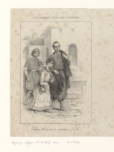 Editor: Here we have "Vrouw en twee kinderen bij marktkoopvrouw," or "Woman and two children with a market vendor," an 1827 etching by Auguste Raffet. It’s quite a detailed street scene, capturing this interesting exchange between social classes. How do you interpret this work? Curator: Well, viewed through a historical lens, this print speaks volumes about the socio-economic dynamics of 19th-century urban life. Consider the Romantic era fascination with depicting everyday life but also highlighting social disparity. Raffet places the viewer within this interaction – observing the stark contrast between the well-dressed woman and the obviously less fortunate market vendor. Editor: It's almost like he’s staging the scene…drawing our eye to the disparities, like you said. Curator: Exactly. Think about the burgeoning print culture at this time. These images weren't just art; they were a form of social commentary distributed widely. How does that change your understanding? Editor: That completely shifts it! It’s not just observation but an intentional act of exposing or commenting on the inequality that's already present. And the print form made that message all the more public. Curator: Precisely! Raffet, through this readily accessible medium, engages the public in a dialogue about poverty, charity, and the rapidly changing social fabric of his time. It’s a political statement, really, veiled within a genre scene. Editor: It’s amazing to realize that something that seems so simple on the surface can carry such complex ideas about its historical context! I won't see etchings the same way again. Curator: And that's the beauty of art history. The art is in conversation with the conditions of its own production, shaping, and reflecting its moment. Always.