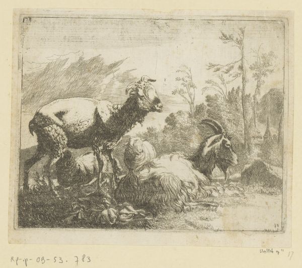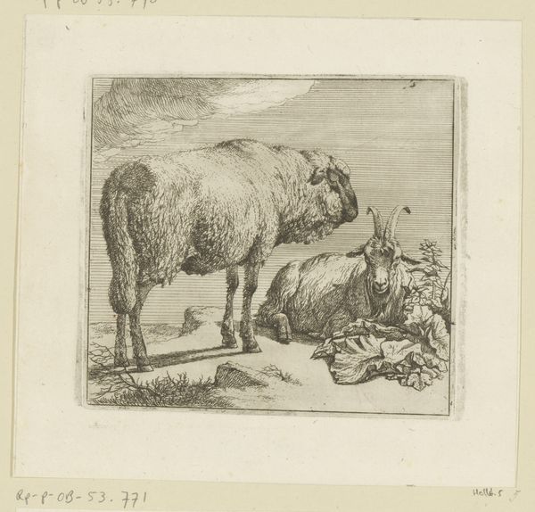 Curator: This etching, titled "Liggend schaap en staande geit bij een hek," or "Lying Sheep and Standing Goat by a Fence," was created by Johann Heinrich Roos in 1671. It’s part of the Rijksmuseum's collection. Editor: It's immediately striking how pastoral and serene it feels. The way the goat seems to stand guard over the sheep... There’s almost a tenderness, wouldn't you agree? Curator: Perhaps, but consider the composition. The linear precision of the etching creates distinct forms. Look at how Roos defines space and volume with line alone, particularly in the textures of the animals’ coats and the rough-hewn fence. Semiotically, these details speak to the artist’s masterful control of his medium. Editor: Indeed, his technique is superb. But within that technical mastery, I can't help but see reflections of the socio-economic conditions. Livestock represented livelihood and sustenance during the Baroque period, speaking to issues of survival, perhaps even social mobility through animal husbandry. How did ownership dynamics then affect marginalized groups? Curator: That’s one way to read it, yes. Yet, focusing solely on socio-economic contexts risks overlooking the formal aspects. Note how the light falls. Roos subtly emphasizes the contrasts, giving the image a striking, near-sculptural quality within a two-dimensional form. Editor: Of course, the aesthetic choices are compelling, but shouldn't we also consider how idealized portrayals of rural life served to mask the harsh realities of labor and unequal distribution of resources? Perhaps the fence acts not as a marker of ownership but of social division... Curator: I see your point about its social interpretation. I am, however, drawn to the artist’s deliberate choice to place the animals off-center. By doing this, and by employing asymmetrical framing, the artwork guides our eyes to roam freely, inviting visual exploration and ensuring our gaze lingers on every minute stroke. Editor: Ultimately, I find this piece intriguing because of its layered narrative – both formally elegant and resonant with the muted cries for equality within its deceptively quiet scene. Curator: It reminds us how much richness exists within the quiet study of form and deliberate design; a composition that uses sparse lines to present dynamic interplay between animal, object and surrounding light.